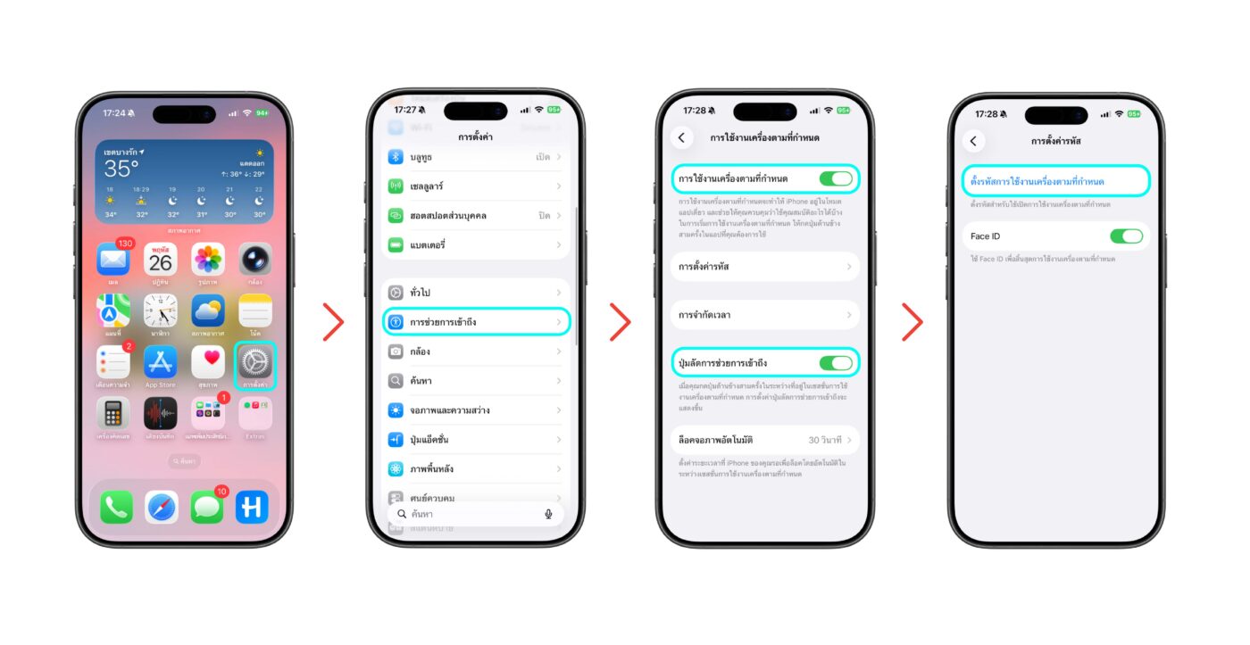 1. เข้าการตั้งค่า > การช่วยการเข้าถึง > การใช้งานเครื่องตามที่กำหนด > เปิดใช้งาน “การใช้งานเครื่องตามกำหนด” “ปุ่มลัดการช่วยการเข้าถึง” และการตั้งค่ารหัส (เพื่อตั้งรหัสเข้าใช้งานหรือจบการใช้งานโหมด)