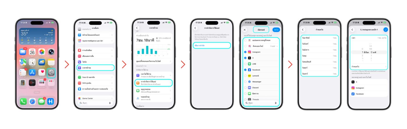 1. เข้าการตั้งค่า > เวลาหน้าจอ > การจำกัดการใช้แอป > เพิ่มการจำกัด > เลือกแอปที่ต้องการจำกัดเวลาการใช้งาน  > สามารถกำหนดวัน เวลา ได้ว่าแอปไหนใช้งานได้กี่ชั่วโมง ใช้งานได้วันไหนบ้าง