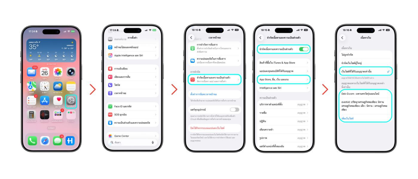 1. เข้าการตั้งค่า > เวลาหน้าจอ > จำกัดเนื้อหาและความเป็นส่วนตัว > เปิด “จำกัดเนื้อหาและความเป็นส่วนตัว” > เลือก “เนื้อหาเว็บ” > “เว็บไซต์ที่ได้รับอนุญาตเท่านั้น” เรากรอกเว็บไซต์เฉพาะที่ใช้งานเข้าไปได้