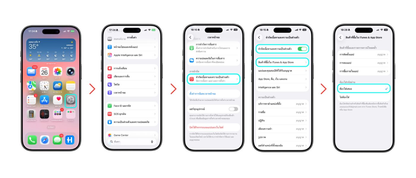 1. เข้าการตั้งค่า > เวลาหน้าจอ > จำกัดเนื้อหาและความเป็นส่วนตัว > “เปิด” จำกัดเนื้อหาและความเป็นส่วนตัว > เลือก “iTune & App Store” > เลือก “ต้องใส่เสมอ” เพื่อป้องกันการติดตั้งแอป ลบแอป หรือเติมเกม โดยที่ไม่ได้ตั้งใจ
