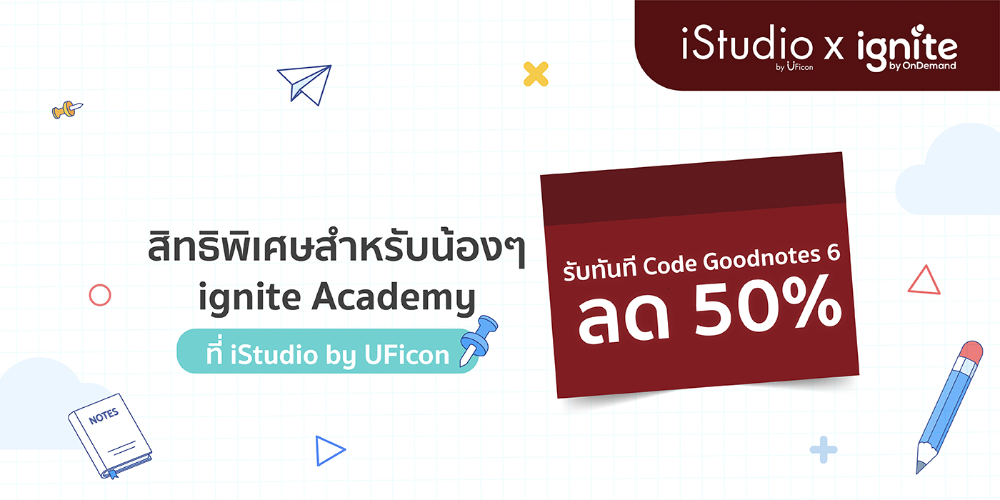 เพื่อรับสิทธิพิเศษสำหรับน้องๆ ignite รับทันที Code Goodnotes 6 ลด 50% ที่ iStudio by UFicon