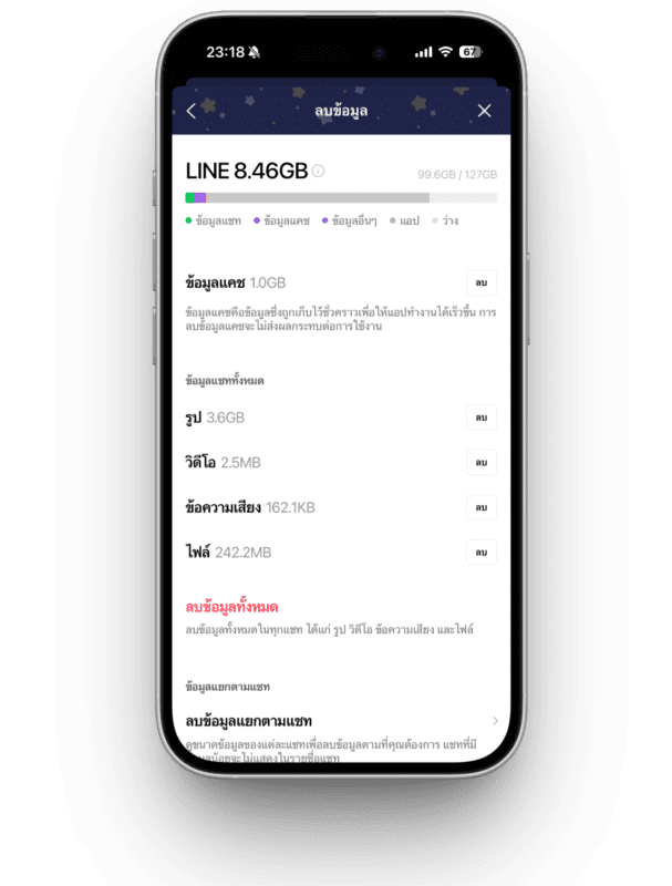 ลบข้อมูลแยกตามแชท 🗂️=  เข้าแอป LINE > ตั้งค่า > แชท > ลบข้อมูล > ลบข้อมูลแยกตามแชท – คลิกเข้าไปจะเจอแชททั้งหมดที่คุยไว้ สามารถเลือกแชทที่เราต้องการลบได้