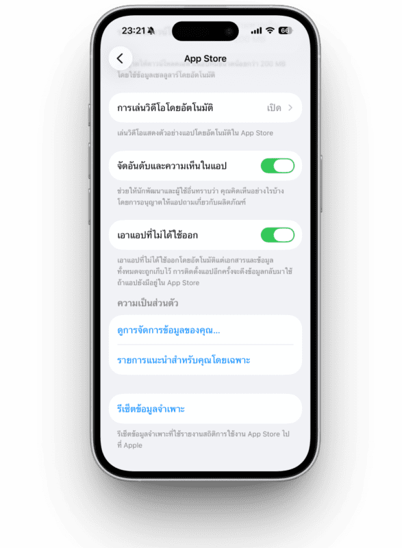 การตั้งค่า > ค้นหาแอป > พิมพ์ว่า “App Store” > เลือก “เอาแอปที่ไม่ได้ใช้ออก”