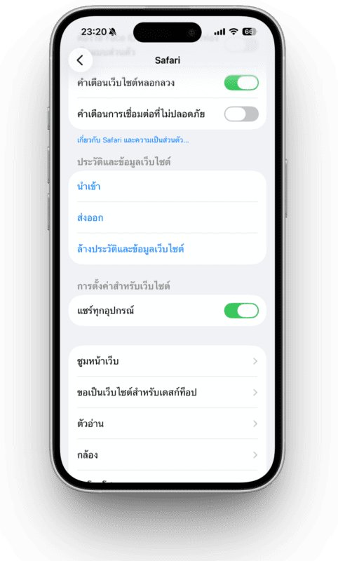 การตั้งค่า > ค้นหาแอป > พิมพ์ว่า “Safari” > เลือก “ล้างประวัติและข้อมูลเว็บไซต์”