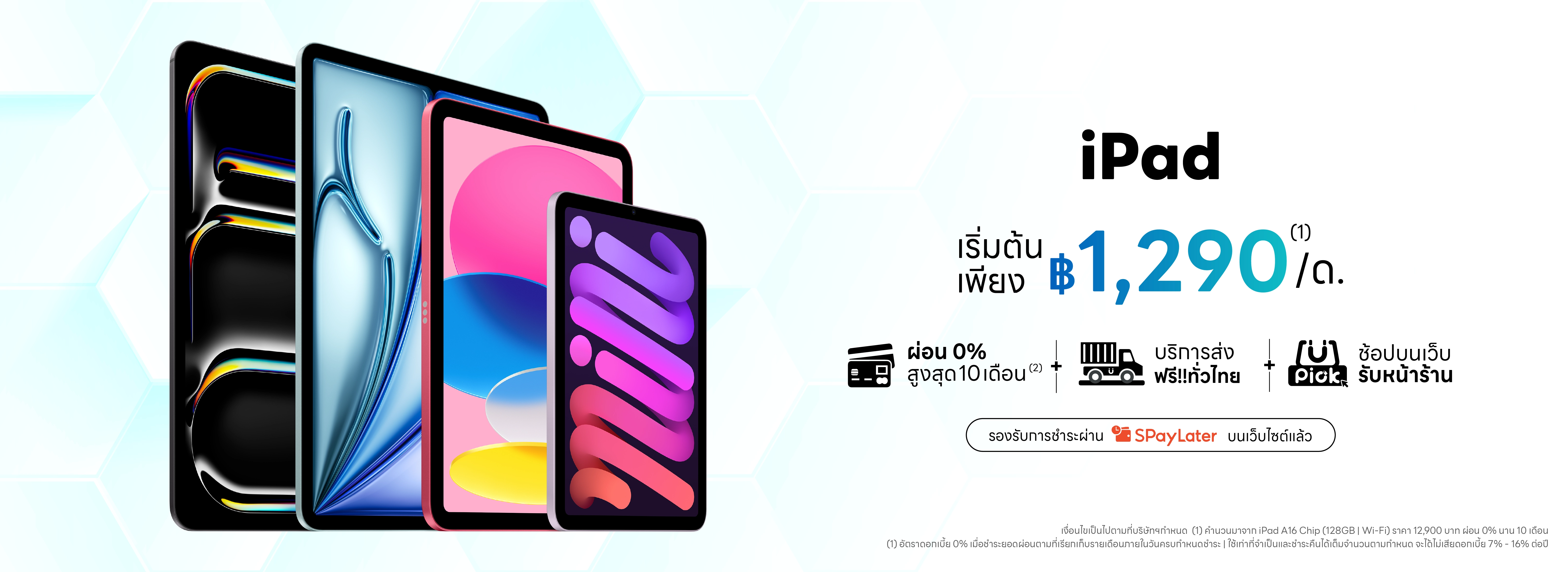 ไอแพด (iPad) ที่ตอบโจทย์ทั้งการเรียน การทำงาน และความบันเทิง มาพร้อมรุ่นใหม่ล่าสุดอย่าง iPad Air M3 และ iPad Pro M5 ที่ใช้ชิปประมวลผลสุดทรงพลัง ดีไซน์บางเบา พกพาสะดวก พร้อมมอบประสบการณ์การใช้งานที่เหนือกว่า และยังมีให้เลือกอีกหลายรุ่น ทั้ง iPad Pro, iPad Air และ iPad mini ครบทุกขนาดและฟังก์ชัน เพื่อให้คุณเลือกได้ตรงตามสไตล์และการใช้งานของคุณมากที่สุด