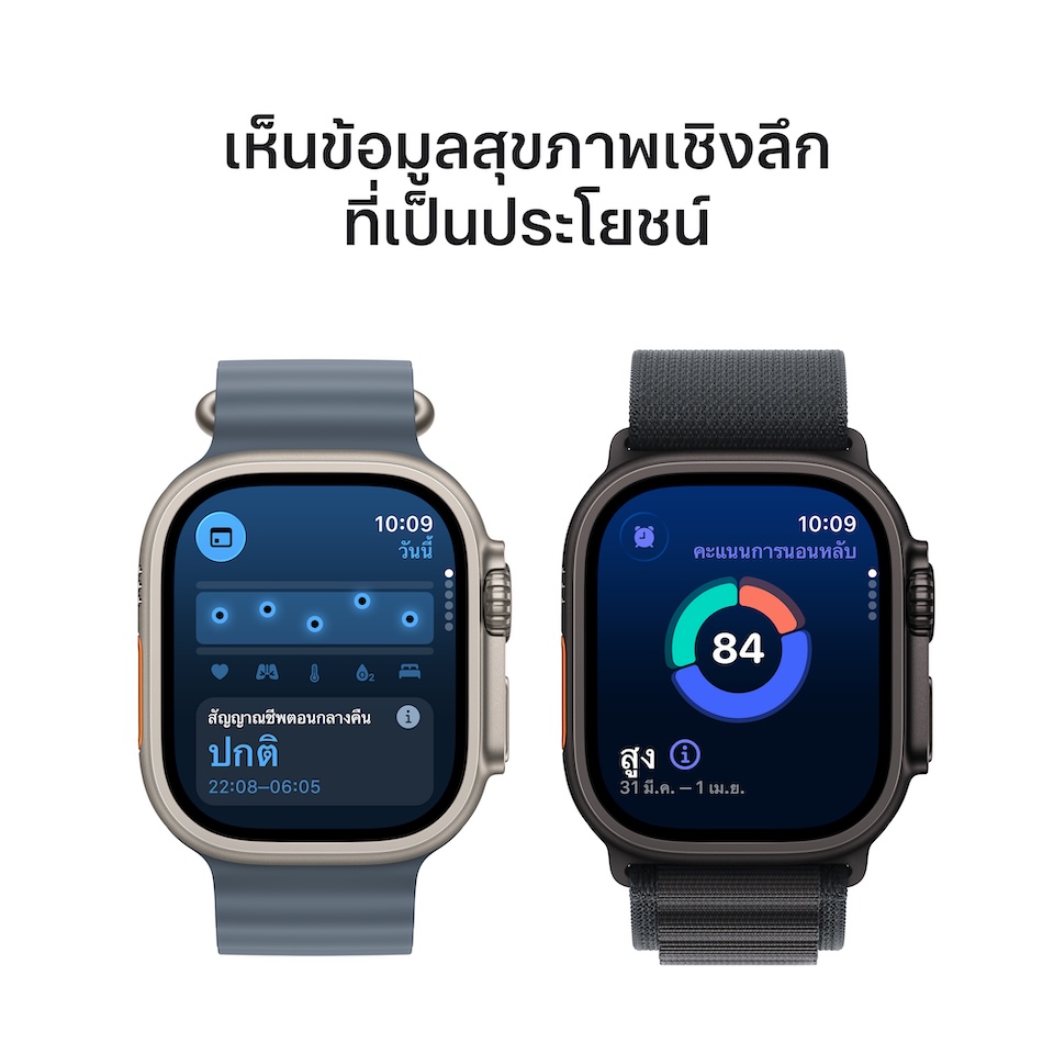 วันนี้ Apple Watch Ultra 3 มาพร้อมแบตเตอรี่ที่ใช้งานได้นานหลายวัน1 และจอภาพที่ใหญ่ที่สุดและสว่างที่สุดบน Apple Watch2 นอกจากนี้ ยังมีตัวชี้วัดขั้นสูง, การออกกำลังกายแบบกำหนดเอง, GPS ความถี่คู่ที่แม่นยำ และข้อมูลเชิงลึกด้านสุขภาพที่สำคัญ เช่น การแจ้งเตือนอัตราการเต้นของหัวใจเร็วหรือช้า และคะแนนการนอนหลับ สมแล้วที่ได้ชื่อ Ultra