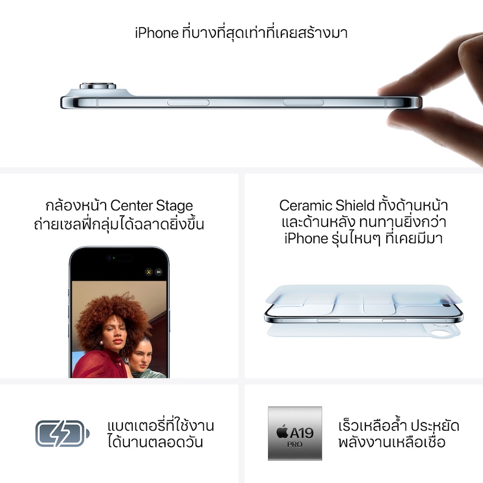 - ชิป A19 Pro เร็วเหลือล้ำ ประหยัดพลังงานเหลือเชื่อ—A19 Pro ชิป iPhone ที่มีประสิทธิภาพที่สุดเท่าที่เคยมีมา เพื่อให้คุณได้สัมผัสประสิทธิภาพระดับโปรในดีไซน์ที่บางเบาเหลือเชื่อ