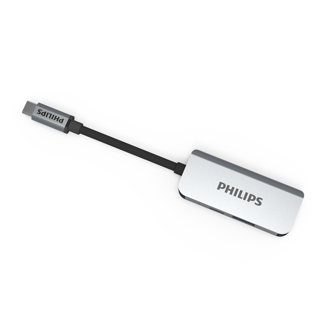 อุปกรณ์เชื่อมต่อ Philips รุ่น 3 in 1 Hub C to HDMI ตัวแปลงพอร์ต USB-C ThunderBolt 3 ที่รองรับภาพ 4K ที่ความถี่ 30Hz สำหรับเชื่อมต่อคอมพิวเตอร์, โน๊ตบุ๊ค, Apple, เข้ากับโปรเจคเตอร์, จอคอม, ทีวีและจอแสดงผลได้ด้วยพอร์ต มีช่องเสียบ PD Charge USB-C 60w ,มีพอร์ต USB 3.0 สามารถถ่ายโอนข้อมูลได้อย่างรวดเร็ว วัสดุแข็งแรงทนทานช่วยระบายความร้อนได้ดี มีขนาดเล็กกะทัดรัด น้ำหนักเบา พกพาสะดวก