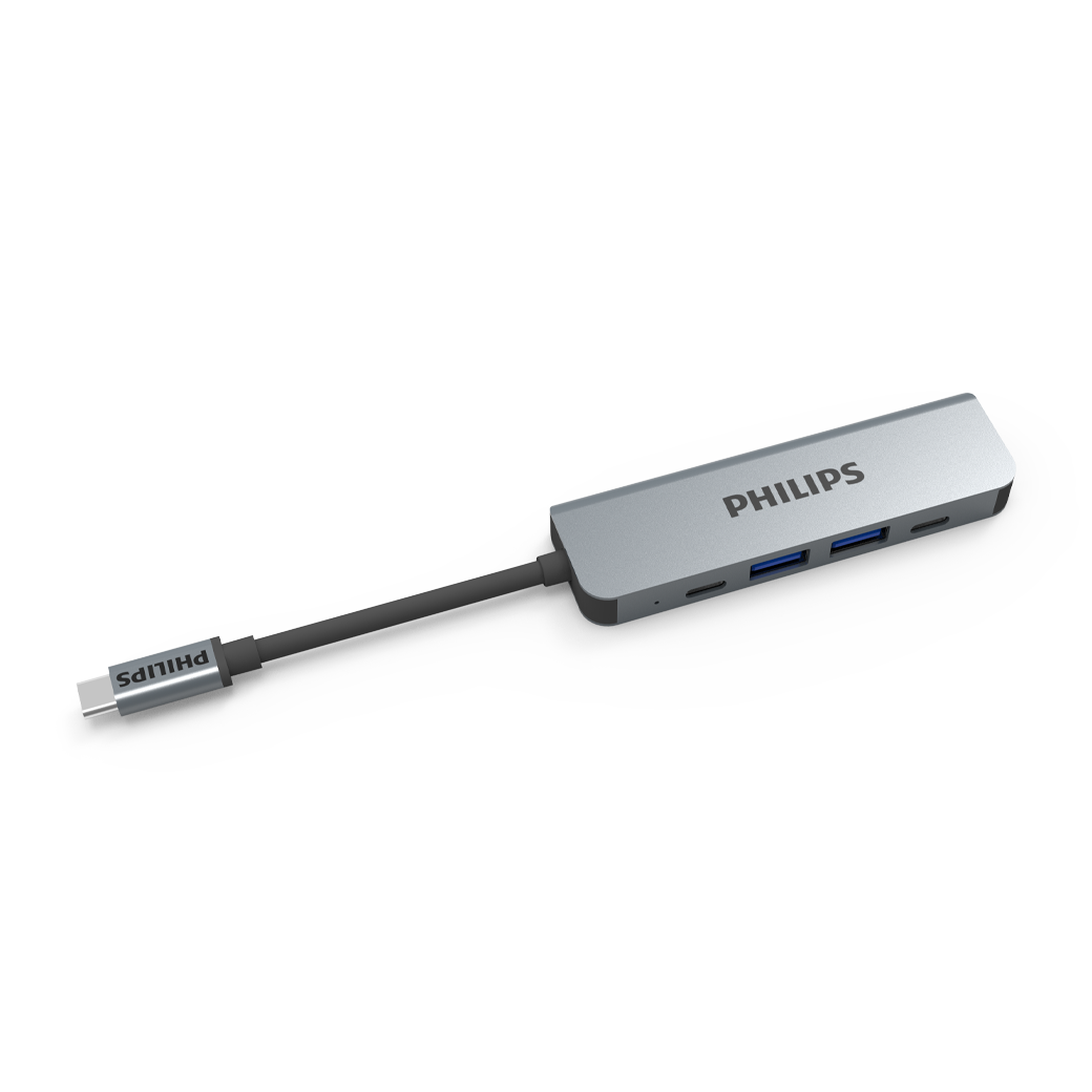 อุปกรณ์เชื่อมต่อ Philips รุ่น 5 in1 Hub C to HDMI ตัวแปลงพอร์ต USB-C / ThunderBolt 3 ที่รองรับภาพ 4K ที่ความถี่ 30Hz สำหรับเชื่อมต่อคอมพิวเตอร์, โน๊ตบุ๊ค, Apple, เข้ากับโปรเจคเตอร์, จอคอม, ทีวีและจอแสดงผลได้ มีช่องเสียบ PD Charge USB-C ซัปพอร์ต100w (input) ช่อง USB-A 3.0 สามารถถ่ายโอนข้อมูลได้อย่างรวดเร็ว, ผลิตจากวัสดุ Aluminum Alloy แข็งแรงทนทานช่วยระบายความร้อนได้ดี มีขนาดเล็กกะทัดรัด น้ำหนักเบา พกพาสะดวก